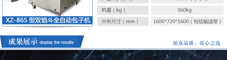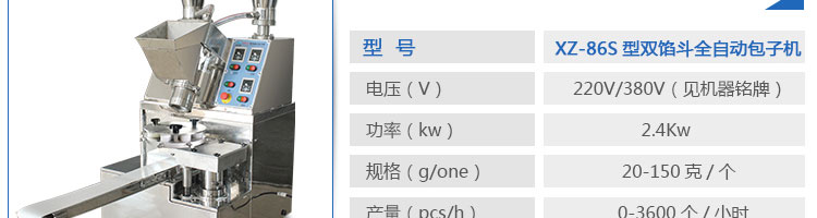 XZ-86S型雙餡斗全自動包子機(jī),可生產(chǎn)各種肉包、肉菜包、菜包、小籠包、湯包、水晶包、圓饅頭、奶黃包、豆沙包、叉燒包、南瓜餅等幾十種包餡制品。適用于賓館、飯店、學(xué)校、機(jī)關(guān)企業(yè)食堂、饅頭或包子加工廠、早餐工程店及速凍食品廠等單位??蓾M足不同客戶群體。免費提供工藝技術(shù)。免費上門培訓(xùn)指導(dǎo)安裝。