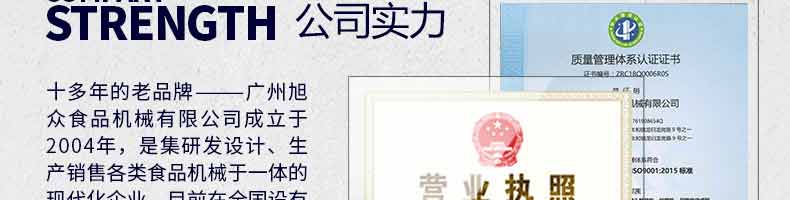 廣州旭眾食品機械有限公司是一家集科研開發(fā),生產設計,營銷服務為一體的現代化生產企業(yè)?,F代化生產車間,精湛制造技術,所產機械歷經市場重重考驗,不斷贏得海內外客戶的贊譽。