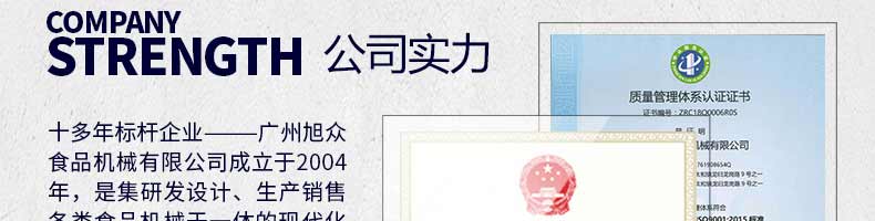 廣州旭眾食品機械有限公司是一家集科研開發(fā),生產(chǎn)設計,營銷服務為一體的現(xiàn)代化生產(chǎn)企業(yè)?,F(xiàn)代化生產(chǎn)車間,精湛制造技術,所產(chǎn)機械歷經(jīng)市場重重考驗,不斷贏得海內外客戶的贊譽。