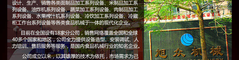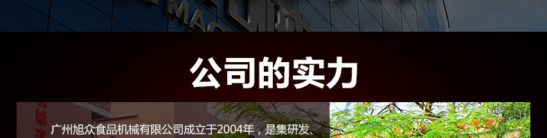廣州旭眾食品機械有限公司是一家集科研開發(fā),生產(chǎn)設(shè)計,營銷服務為一體的現(xiàn)代化生產(chǎn)企業(yè)。現(xiàn)代化生產(chǎn)車間,精湛制造技術(shù),所產(chǎn)機械歷經(jīng)市場重重考驗,不斷贏得海內(nèi)外客戶的贊譽。
