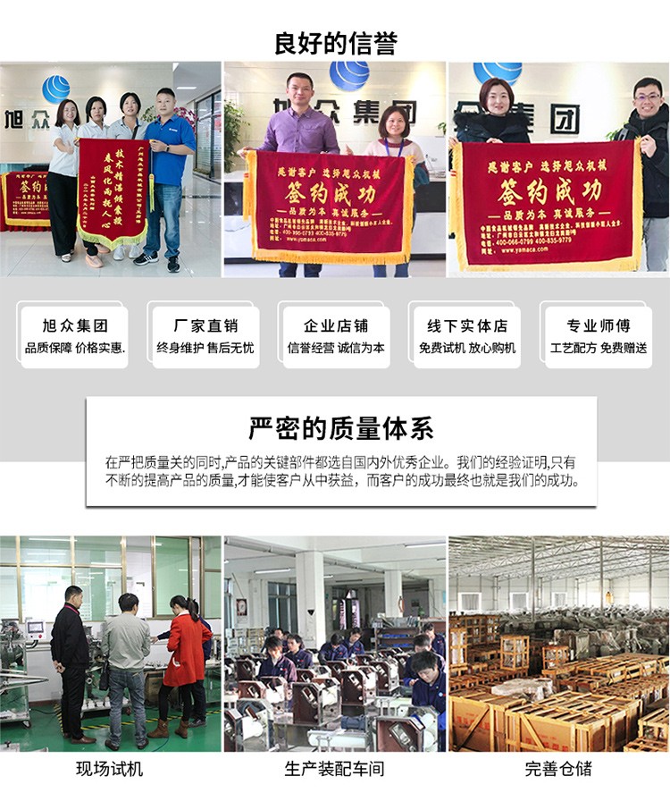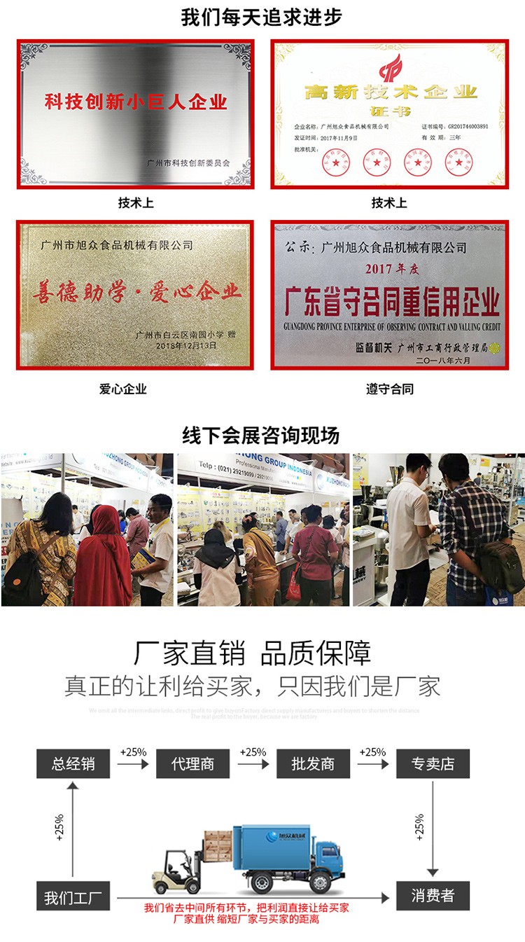 廣州旭眾食品機(jī)械有限公司是一家集科研開發(fā),生產(chǎn)設(shè)計,營銷服務(wù)為一體的現(xiàn)代化生產(chǎn)企業(yè)?,F(xiàn)代化生產(chǎn)車間,精湛制造技術(shù),所產(chǎn)機(jī)械歷經(jīng)市場重重考驗,不斷贏得海內(nèi)外客戶的贊譽(yù)。