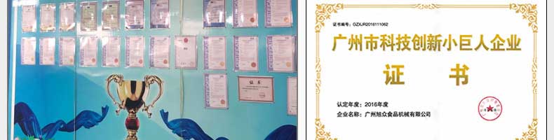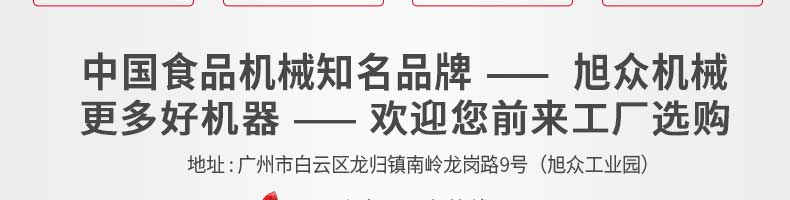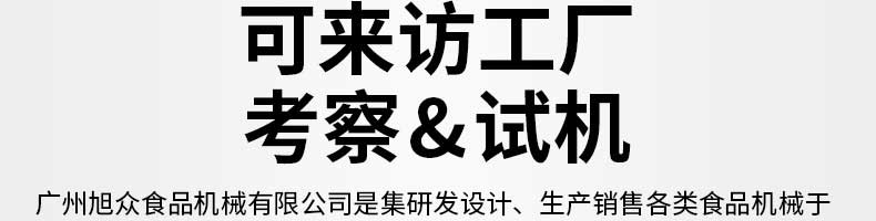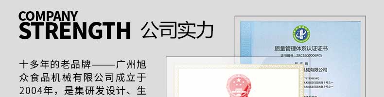 廣州旭眾食品機械有限公司是一家集科研開發(fā),生產(chǎn)設(shè)計,營銷服務(wù)為一體的現(xiàn)代化生產(chǎn)企業(yè)。現(xiàn)代化生產(chǎn)車間,精湛制造技術(shù),所產(chǎn)機械歷經(jīng)市場重重考驗,不斷贏得海內(nèi)外客戶的贊譽。