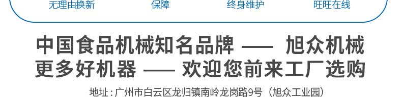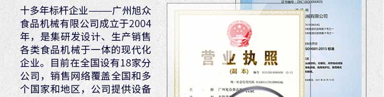 廣州旭眾食品機械有限公司是一家集科研開發(fā),生產設計,營銷服務為一體的現代化生產企業(yè)。現代化生產車間,精湛制造技術,所產機械歷經市場重重考驗,不斷贏得海內外客戶的贊譽。