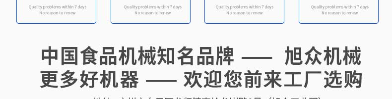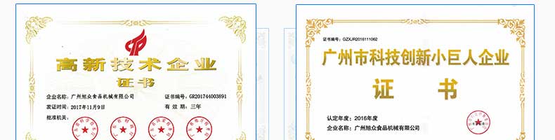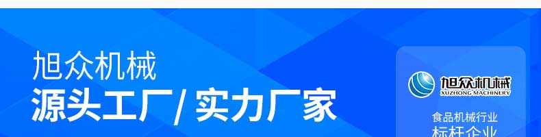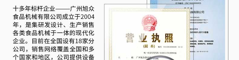 廣州旭眾食品機械有限公司是一家集科研開發(fā),生產設計,營銷服務為一體的現(xiàn)代化生產企業(yè)?,F(xiàn)代化生產車間,精湛制造技術,所產機械歷經(jīng)市場重重考驗,不斷贏得海內外客戶的贊譽。