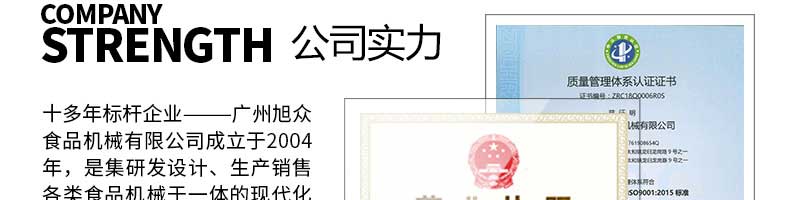 廣州旭眾食品機械有限公司是一家集科研開發(fā),生產(chǎn)設計,營銷服務為一體的現(xiàn)代化生產(chǎn)企業(yè)?,F(xiàn)代化生產(chǎn)車間,精湛制造技術,所產(chǎn)機械歷經(jīng)市場重重考驗,不斷贏得海內(nèi)外客戶的贊譽。