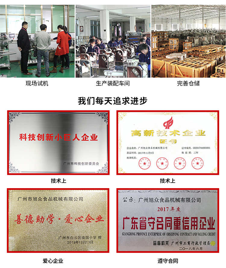 廣州旭眾食品機(jī)械有限公司是一家集科研開發(fā),生產(chǎn)設(shè)計(jì),營(yíng)銷服務(wù)為一體的現(xiàn)代化生產(chǎn)企業(yè)?,F(xiàn)代化生產(chǎn)車間,精湛制造技術(shù),所產(chǎn)機(jī)械歷經(jīng)市場(chǎng)重重考驗(yàn),不斷贏得海內(nèi)外客戶的贊譽(yù)。