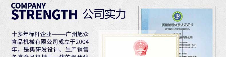 廣州旭眾食品機(jī)械有限公司是一家集科研開(kāi)發(fā),生產(chǎn)設(shè)計(jì),營(yíng)銷(xiāo)服務(wù)為一體的現(xiàn)代化生產(chǎn)企業(yè)?,F(xiàn)代化生產(chǎn)車(chē)間,精湛制造技術(shù),所產(chǎn)機(jī)械歷經(jīng)市場(chǎng)重重考驗(yàn),不斷贏得海內(nèi)外客戶(hù)的贊譽(yù)。