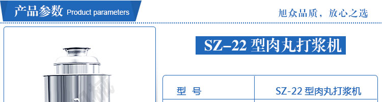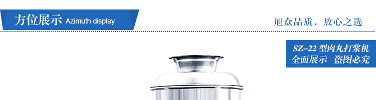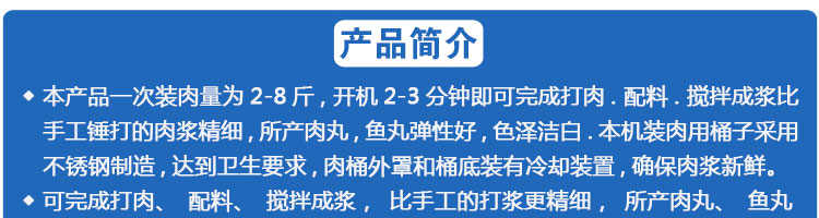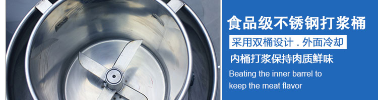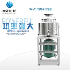 SZ-22型肉丸打漿機(jī),本機(jī)裝肉用桶子采用不銹鋼制造,達(dá)到衛(wèi)生要求,肉桶外罩和桶底裝有冷卻裝置,確保肉漿新鮮。比手工的打漿更精細(xì),所產(chǎn)肉丸、魚(yú)丸彈性好,色澤潔白。