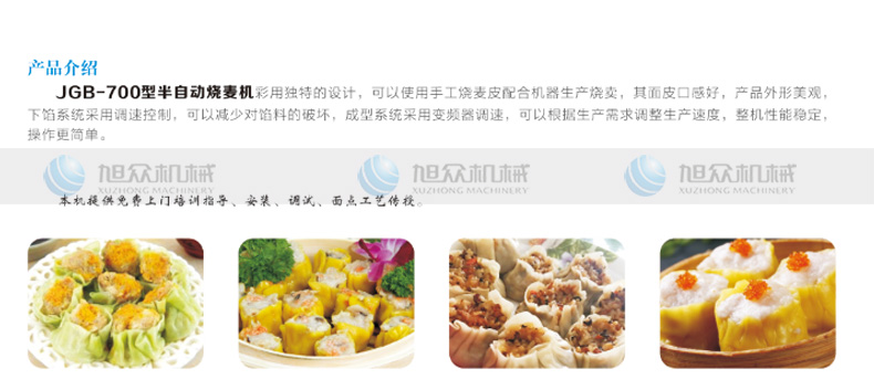 JGB-700燒麥機,采用特的設計,可以使用手工燒麥皮配合機器生產燒賣,其面皮口感好,產品外形美觀下餡系統(tǒng)采用調速控制,可以減少對餡料的破壞,成型系統(tǒng)呆用變頻器調速,可以根據(jù)生產需求調整生產速度,整機性能穩(wěn)定操作更簡單