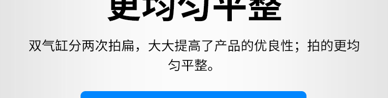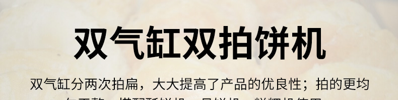 XZ-7200型雙拍餅機,雙氣缸雙拍餅機雙氣缸分兩次拍扁,大大提高了產(chǎn)品的優(yōu)良性;拍的更均勻平整。搭配酥餅杋、月餅機、糍粑機使用。告別手工、更高效率。讓拍餅機改變生活,降低手工成本,省去繁瑣的手工工序,提高生活品質(zhì)。