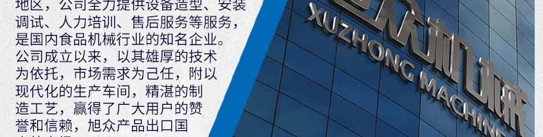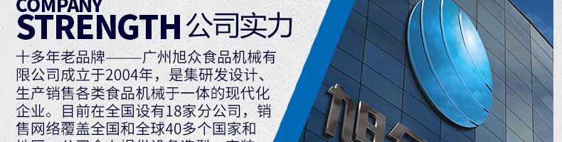 廣州旭眾食品機(jī)械有限公司是一家集科研開發(fā),生產(chǎn)設(shè)計(jì),營銷服務(wù)為一體的現(xiàn)代化生產(chǎn)企業(yè)。現(xiàn)代化生產(chǎn)車間,精湛制造技術(shù),所產(chǎn)機(jī)械歷經(jīng)市場(chǎng)重重考驗(yàn),不斷贏得海內(nèi)外客戶的贊譽(yù)。