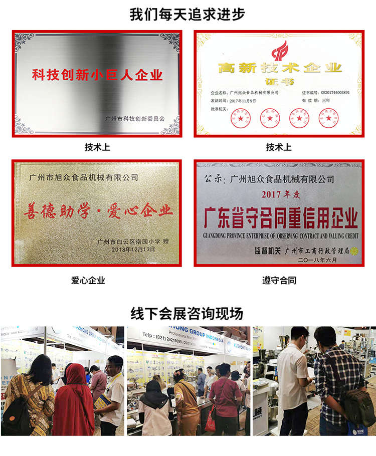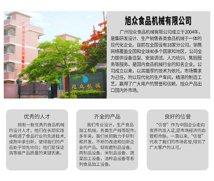 廣州旭眾食品機械有限公司是一家集科研開發(fā),生產設計,營銷服務為一體的現代化生產企業(yè)?,F代化生產車間,精湛制造技術,所產機械歷經市場重重考驗,不斷贏得海內外客戶的贊譽。