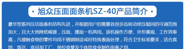 SZ40、SZ60壓面面條機(jī)系列,本機(jī)壓面、揉面一機(jī)兩用,用于制作面條、云吞皮、糕點(diǎn)、面點(diǎn)等食品,生產(chǎn)的產(chǎn)品韌性大、耐煮、不易斷,適合于賓館、飯店、食堂、面包廠及各類(lèi)面點(diǎn)加工單位或個(gè)體商戶(hù)使用。