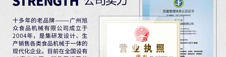 廣州旭眾食品機械有限公司是一家集科研開發(fā),生產(chǎn)設(shè)計,營銷服務為一體的現(xiàn)代化生產(chǎn)企業(yè)?,F(xiàn)代化生產(chǎn)車間,精湛制造技術(shù),所產(chǎn)機械歷經(jīng)市場重重考驗,不斷贏得海內(nèi)外客戶的贊譽。