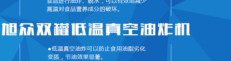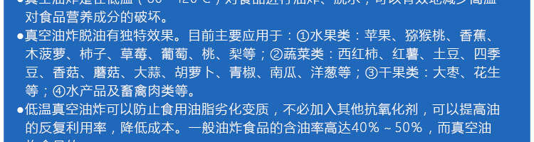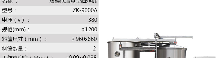 zk-1200雙罐低溫真空油炸機,適用于水果類、蔬菜類、干果類、水產品機畜禽肉類等。油炸食品不易褪色、褐色,可以保持原料本身的顏色