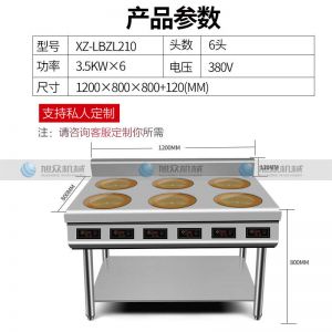 名稱XZ-LBZL210圓頭六頭電陶爐 電源380V 功率3.5KW*6 產量聯系銷售員 尺寸1200×800×800+120MM 重量聯系銷售員 規格頭數:6頭 其他